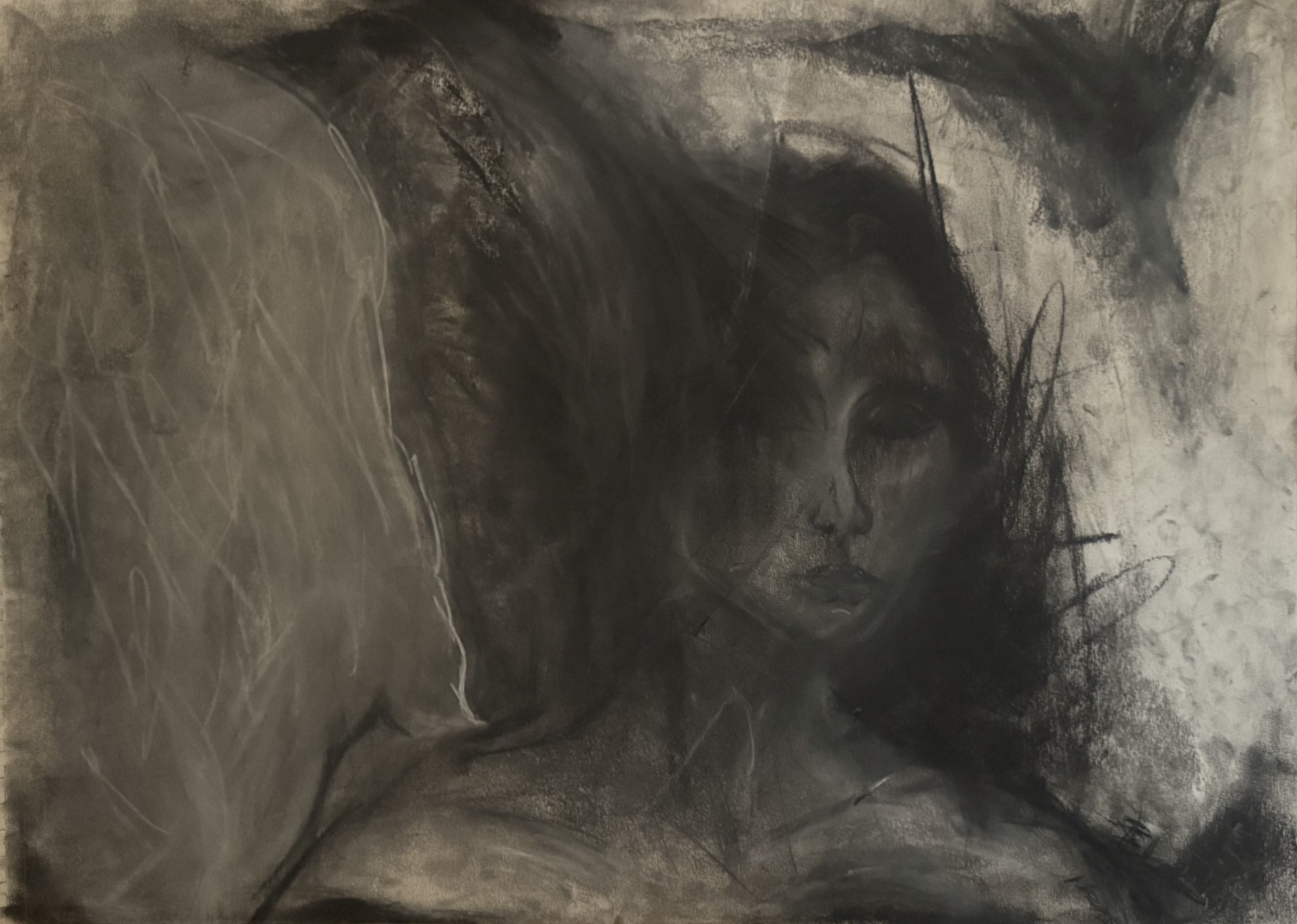 A monochrome charcoal sketch of a woman with closed eyes, delicate features, and long hair, placing her forehead against another person's face, with an angelic figure swaying in front.